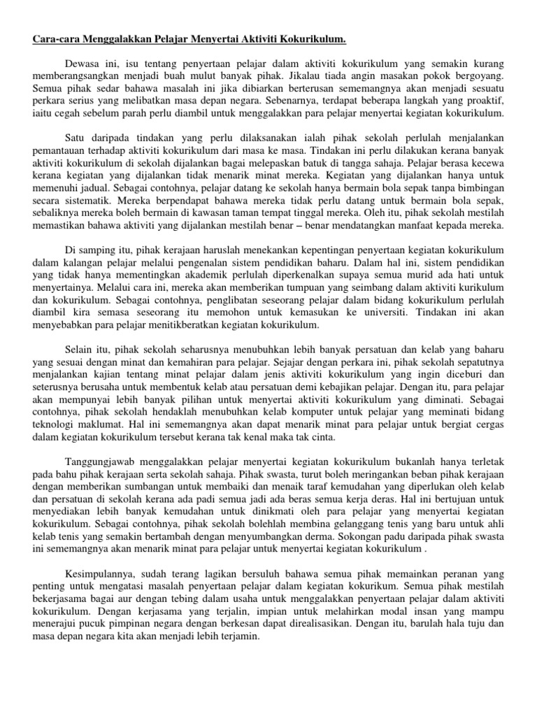 Selain itu masa yang diperuntukkan untuk sesuatu aktiviti janganlah terlalu panjang dan jika ia perlu memakan masa yang panjang sebaiknya diselangkan dengan masa rehat untuk mengelakkan mereka mudah hilang tumpuan. Langkah ini mempercepatkan lagi perpaduan dan rasa harmoni antara kaum di. Penutup Karangan Menarik Minat menyertai aktiviti kokurikulum.